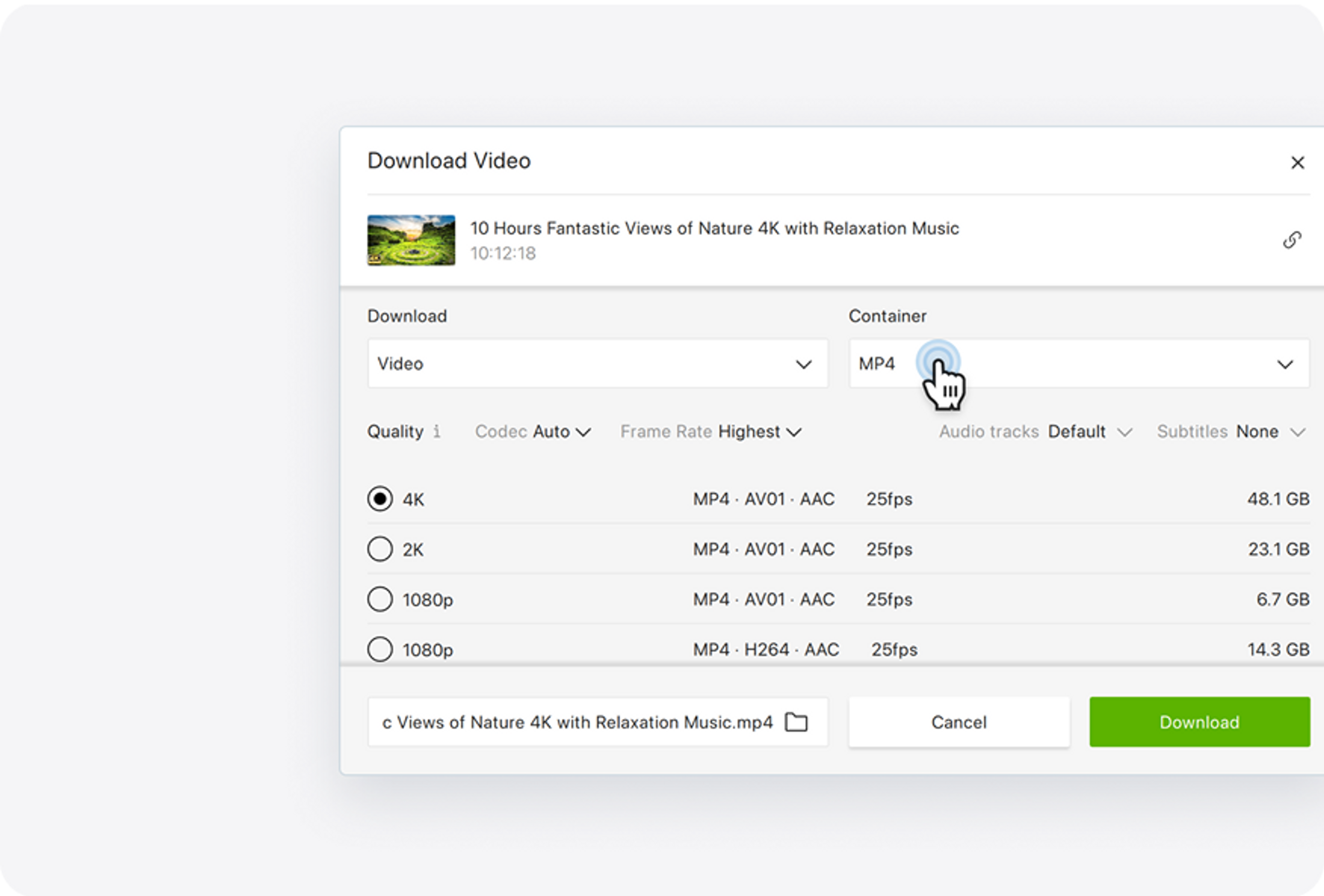 You can download subtitles as separate files or with embedded captions inside MP4 videos.