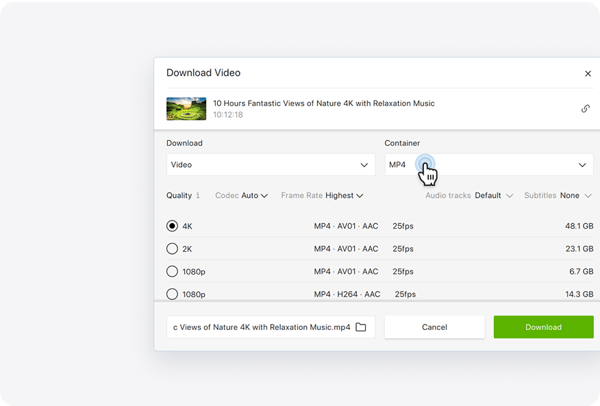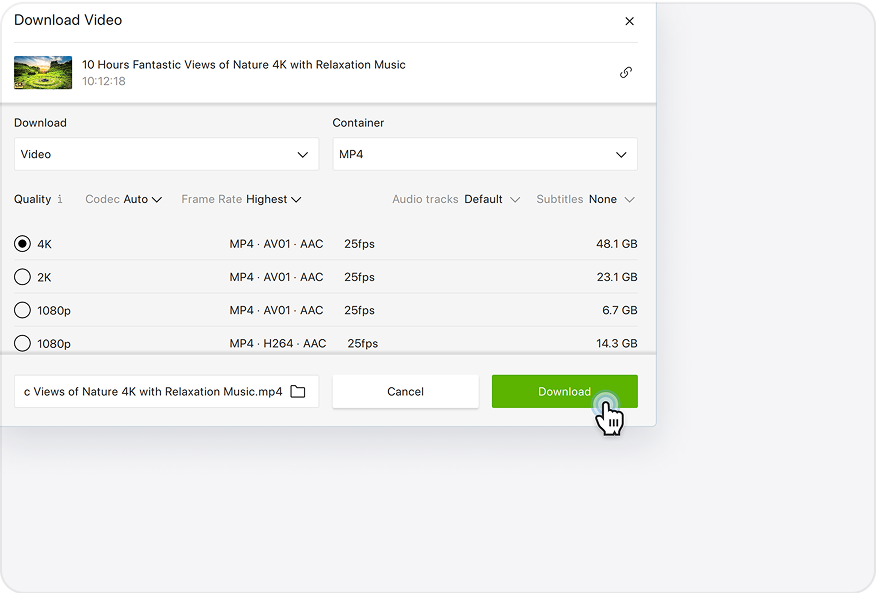 You can download subtitles as separate files or with embedded captions inside MP4 videos.